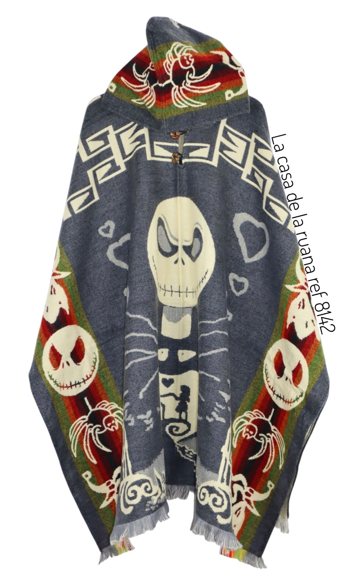 El diseño de esta ruana es largo por lo cual queda entre la mitad de la pierna y la rodilla dependiendo de la estatura de la persona.
