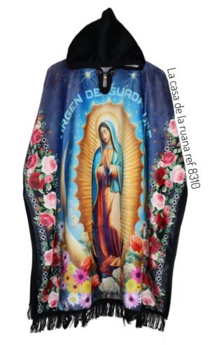 El diseño de esta ruana es largo por lo cual queda entre la mitad de la pierna y la rodilla dependiendo de la estatura de la persona.